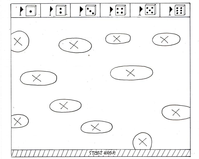 Saya oprek permainan klasik ini menjadi single-play. Enam gawang berada di ujung atas kertas, lalu pemain melontarkan pensil untuk mencapai salah satunya, yang telah ditentukan sebelumnya dengan kocokan dadu. Di area tengah (antara garis start dan gawang), ada beberapa batu yang tidak boleh tersenggol garis pensil.