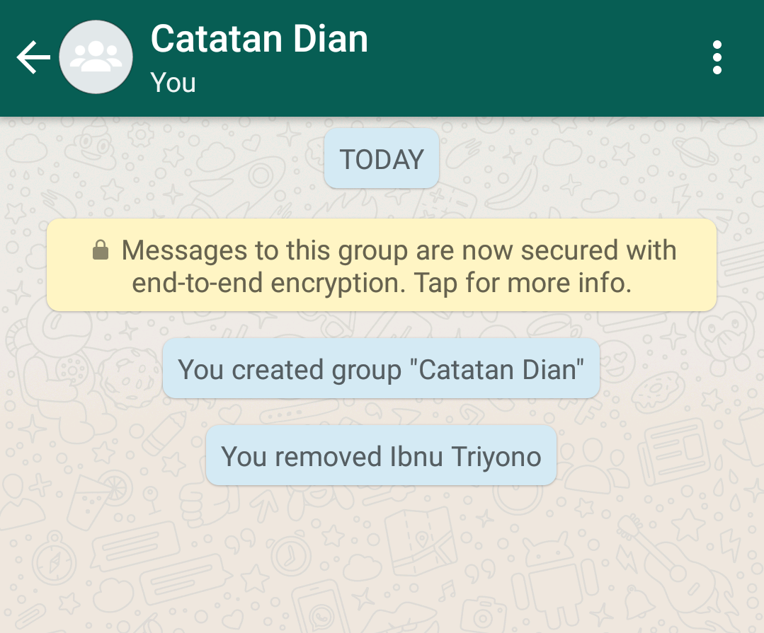 Pilihan saya jatuh pada Whatsapp. Satu grup di mana adminnya adalah saya, anggotanya adalah saya, dan kontennya dari saya untuk saya.